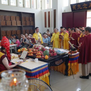 華人世界在中元節(農曆7月15日)都有慎終追思祭祖及超渡亡靈的習俗,板橋榮民之家恭請本會指導上師 庫頓尊哲雍仲尊者 恆性嘉措仁波且波且在板橋榮民之家榮靈祠堂修法超薦設在祠堂內一萬多位亡靈,同時為居住在榮民之家的爺爺奶奶們消災祈福。一進祠堂看到牆上安了一萬多個亡者牌位,彷彿看到他們年輕時英姿煥發的姿態,不由自主的感念他們一生貢獻國家,看到佛前擺滿了供品更讚嘆他們同袍情深。